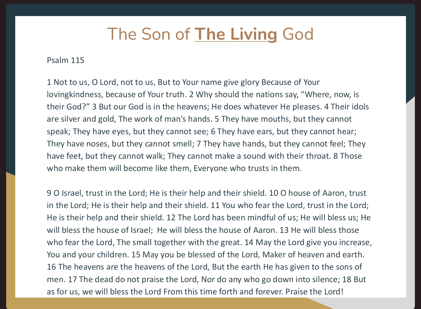 August 11, 2024 Who Do People Say That I Am? Speaker: Robbie Moreland Series: Questions Jesus Asked Passage: Matthew 16 Service Type: AM A lesson on Matthew 16 related to the idols of the land, who people thought Jesus was, and the disciples answer in response. Download Files Notes Topics: Christ, Idols « How to Fail Fruits Of The Spirit P4 »